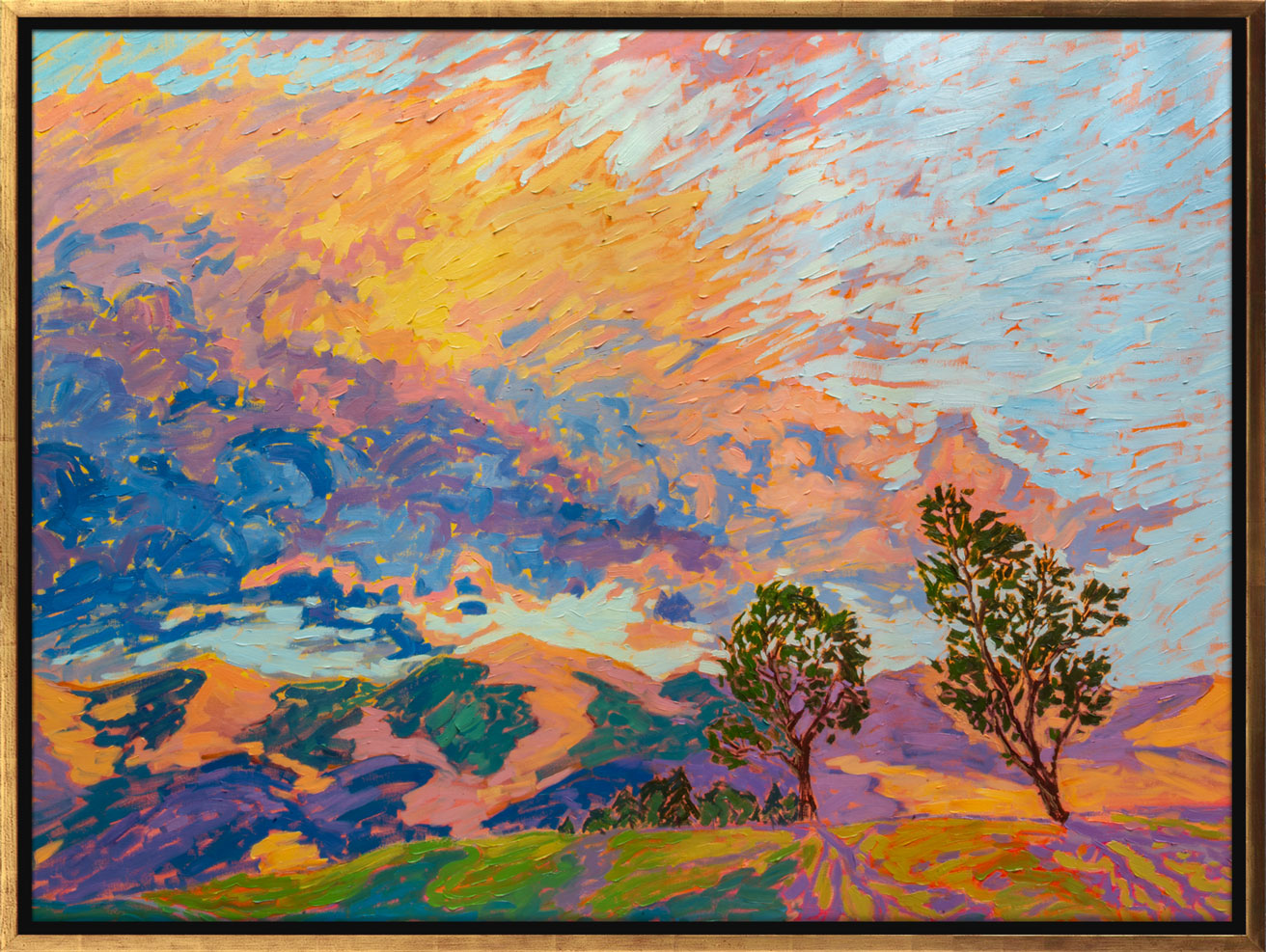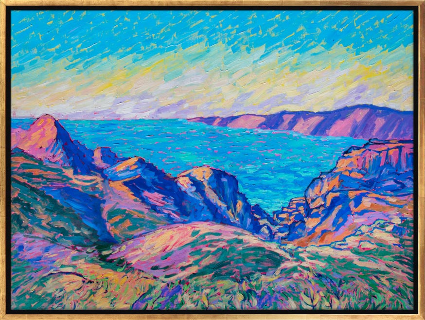 "Mountain of Gold" is an modern oil painting of sun illuminated volcanic Mountain in Tenerife. Late evening sunlight casting a dramatic light on red and gold rocky peaks with pastel colored clouds chased out by the wind, on hot blue sky, contrasting colors of the entire painting scene.