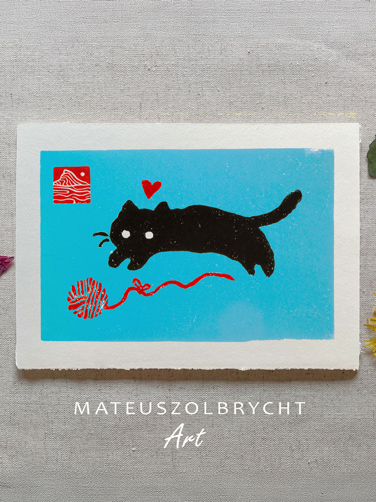 Giclée print of an original Linocut "Cat in Jump" on blue background with an artist stamp, made on Etching Press I made with my hands. Artwork depicts a cat playing with red yarn ball.